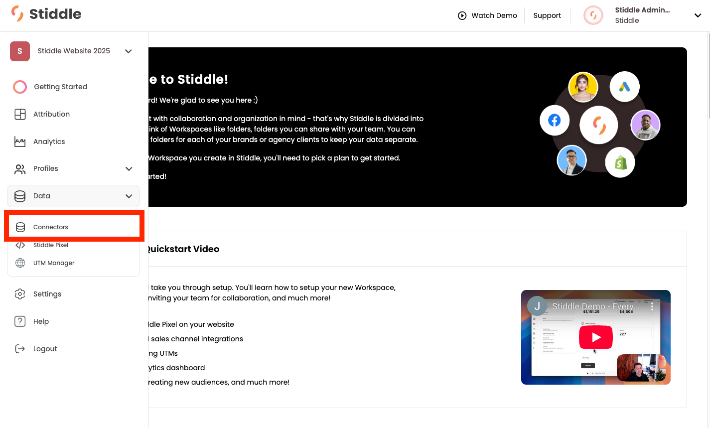 First, log into your Stiddle account and select the workspace you'd like to connect Zapier to. Then, hover over the left side navigation, hover over "Data", and select "Connectors".