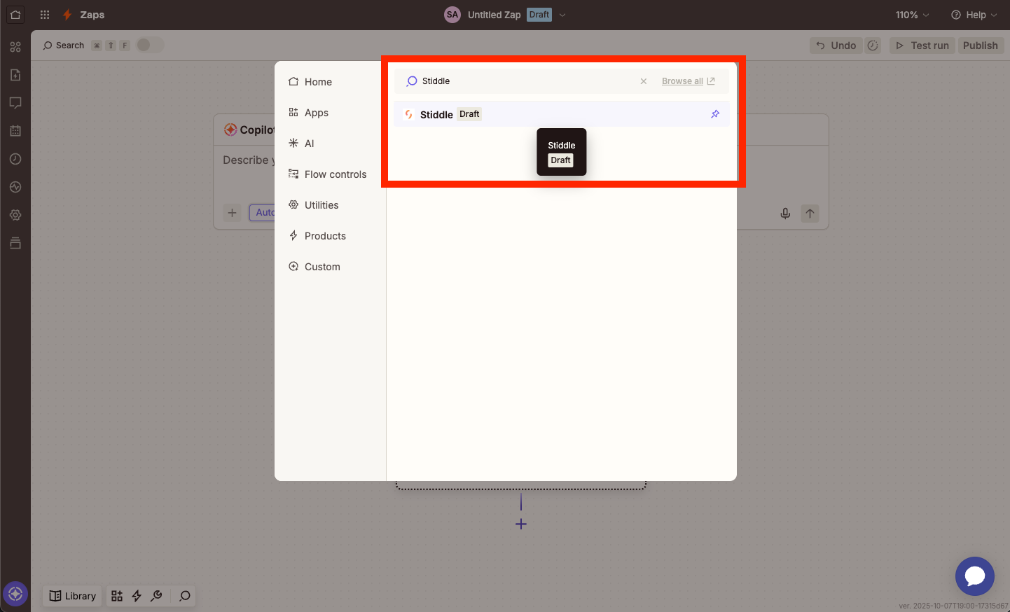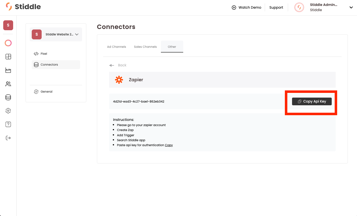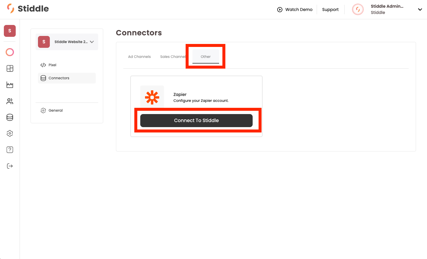 Once on the connector page, select the "Other" tab, then select the "Connect to Stiddle" button next to the Zapier logo.