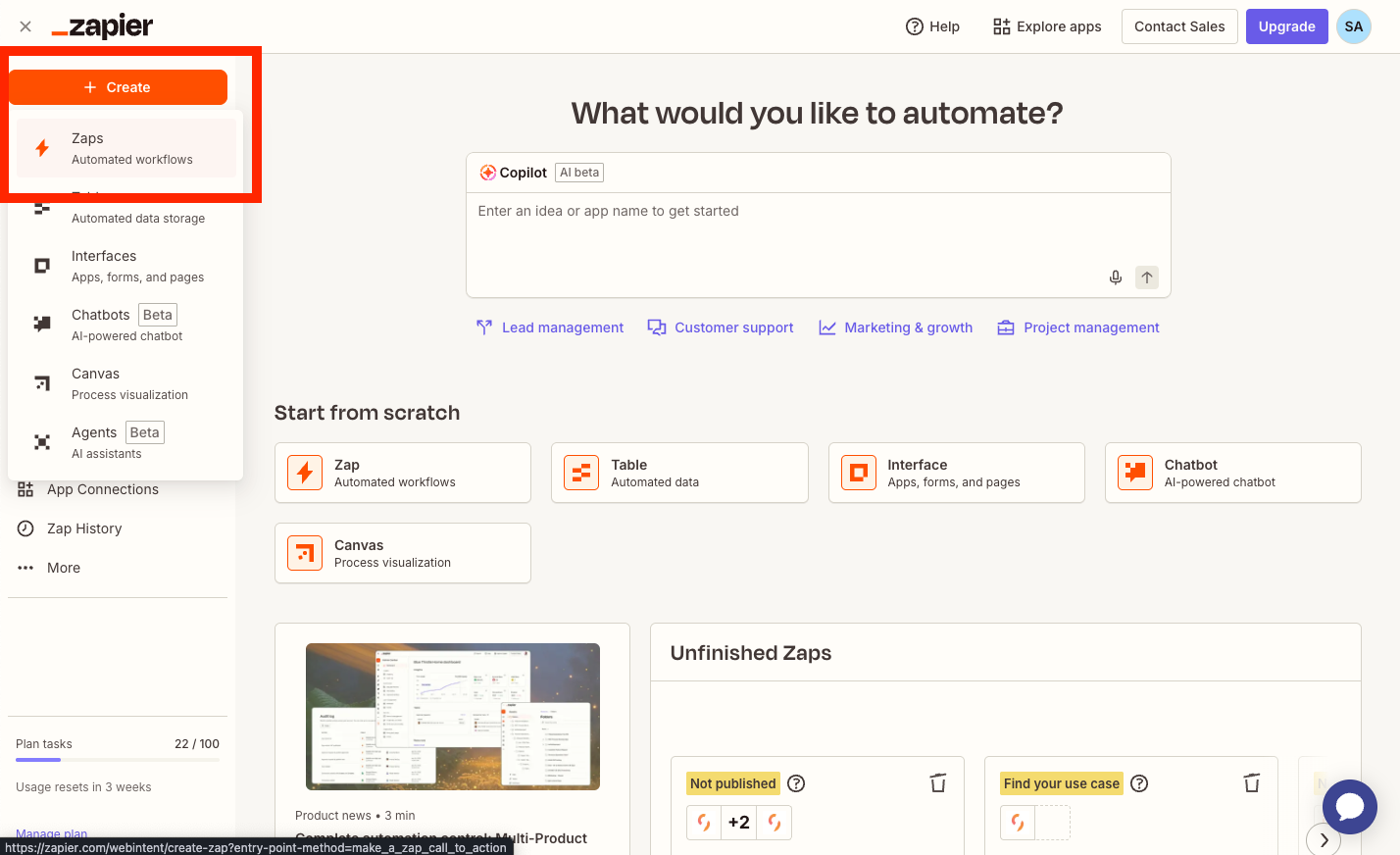 First, login to your Zapier account, select the "Create" button in the left-hand navigation, then select "Zaps".