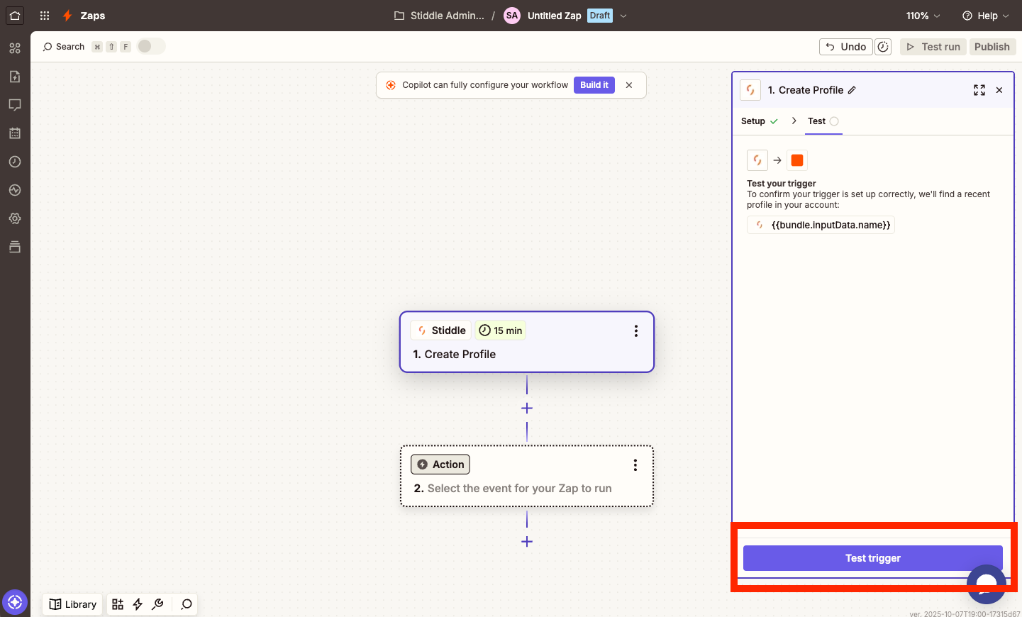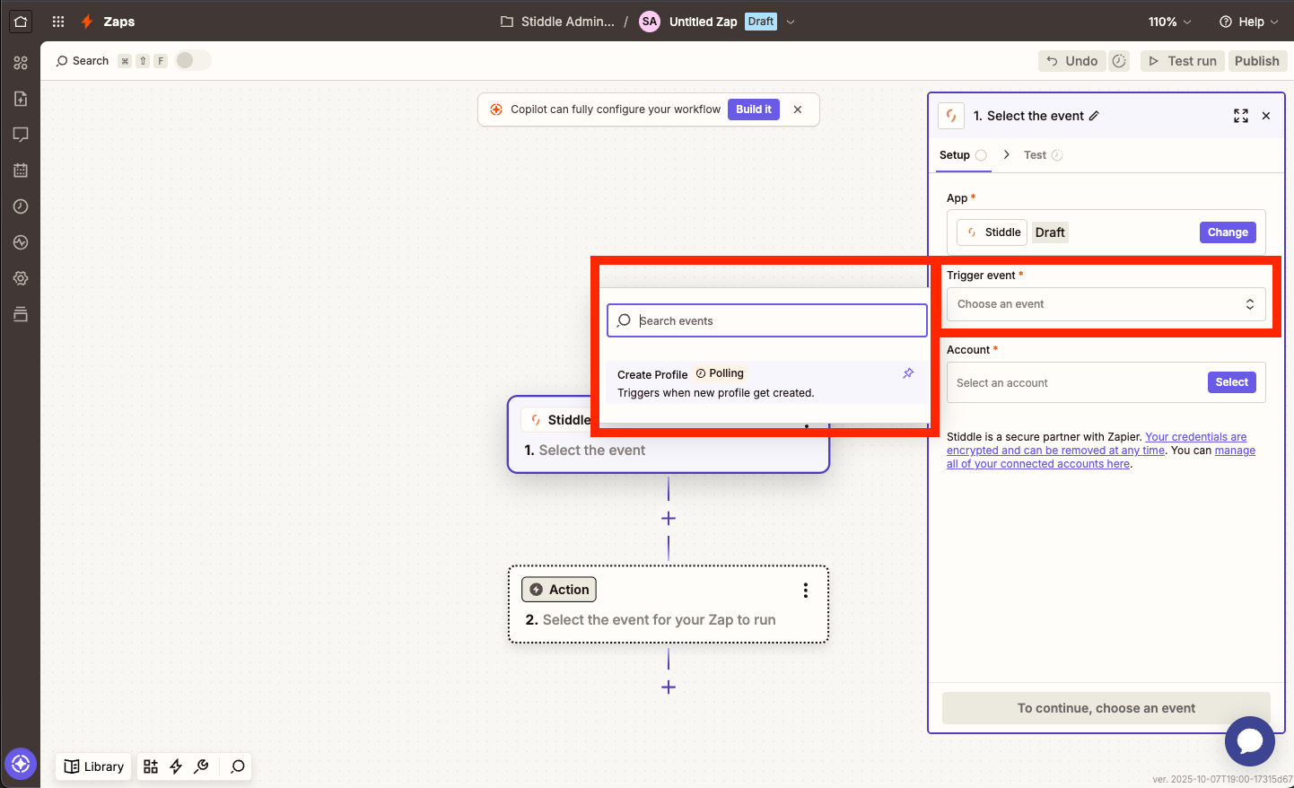 First, select the "Trigger Event", you'll see several options, select one. In this example, we've selected "Create Profile". This means that every time a new profile is generated in your Stiddle workspace, it will be triggered here in Zapier.