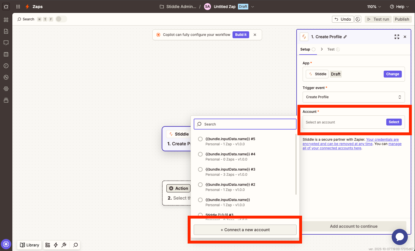 Now it's time to authenticate and connect your Stiddle account. To do so, simply select the "Account" button, then select "Create a new account". Alternatively, if you've already connect a Stiddle workspace to Zapier, you will see it displayed in the list.