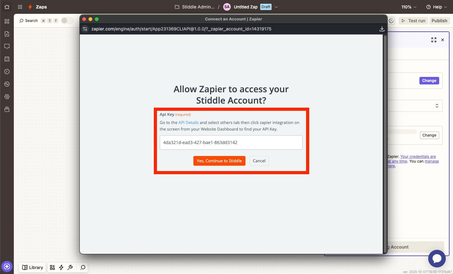 You will now need to paste the Stiddle API Key that you copied in the previous step. Simply paste the API Key in the popup, then select "Yes, continue to Stiddle".