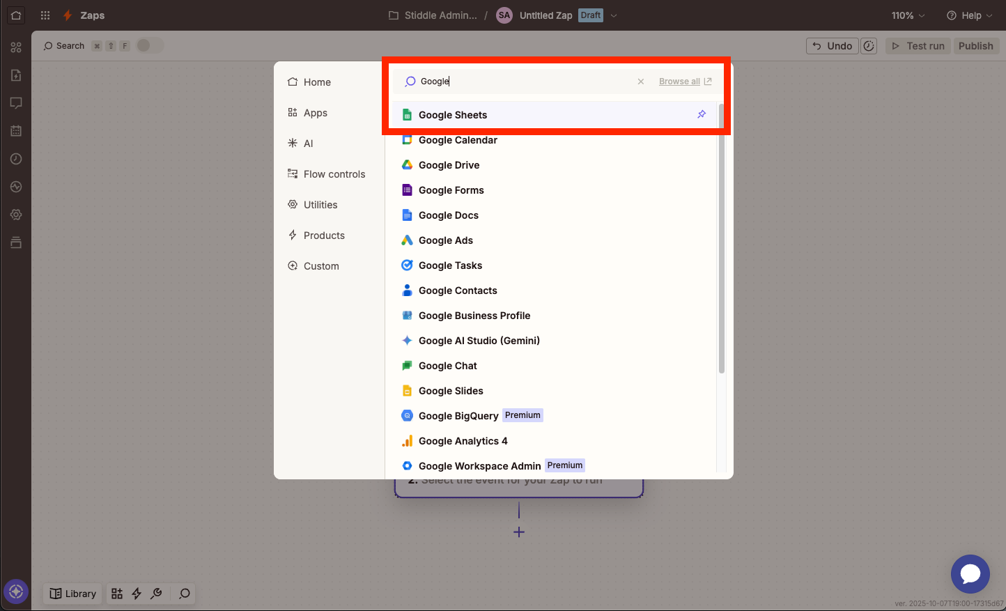 To do so, first we'll need to select an action. In this case, we'll type "Google Sheets" and select.