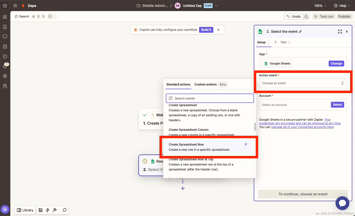Next, simply select an "Action Event", in this example we're going to select "Create Spreadsheet Row" - since we want all new Stiddle profiles to be added into a new row within Google Sheets.