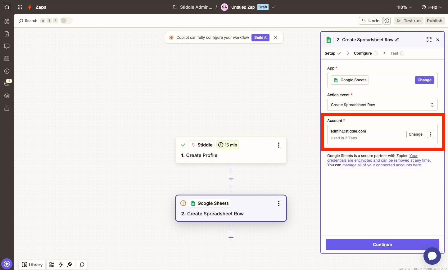 You will now see your Stiddle workspace connected to Zapier and selected under "Account". To continue, select the "Continue" button.