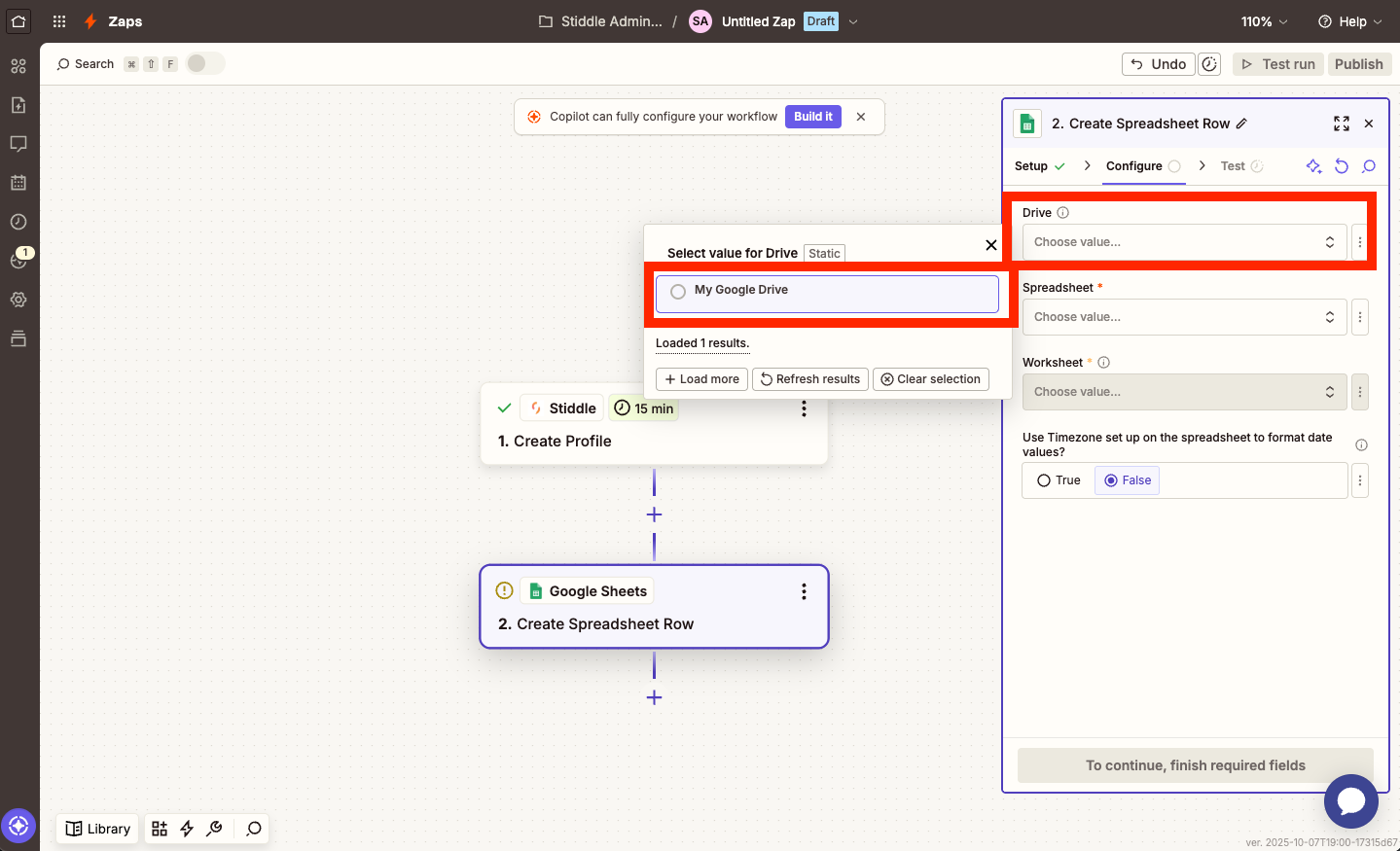 From here, you'll need to select a few options so Zapier knows which Google Sheet to send Stiddle profiles to. To start, select your "Drive", "Spreadsheet", and Worksheet".